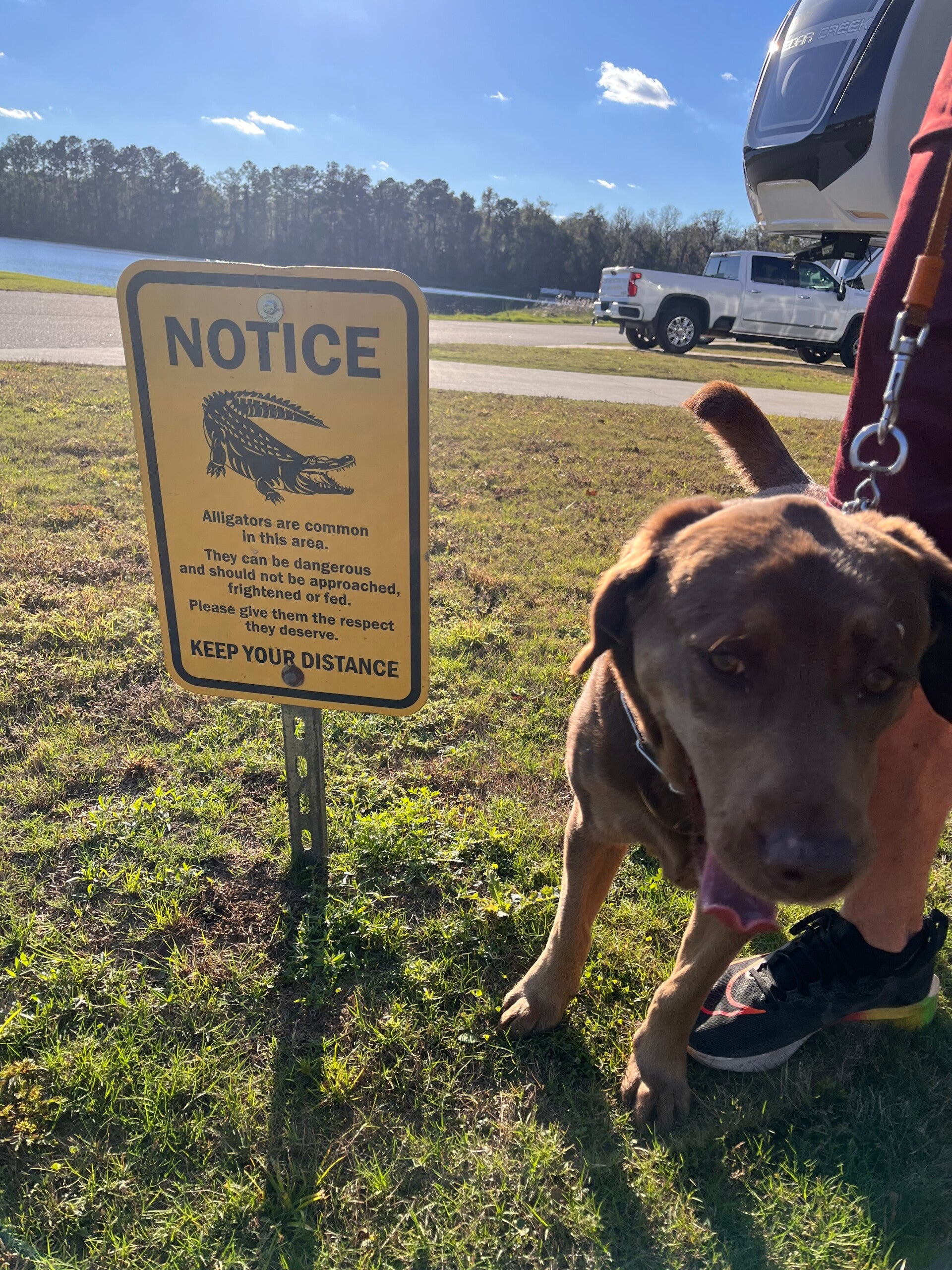 Stayed at a very nice resort (lazy river, 3 pools, and too many amenities to list). Dana enjoyed her water aerobics time. With low lying flood waters and a lake, we were warned about the alligators and signs were posted all over. Needless to say Gracie and Jim were on high alert during walks and runs.