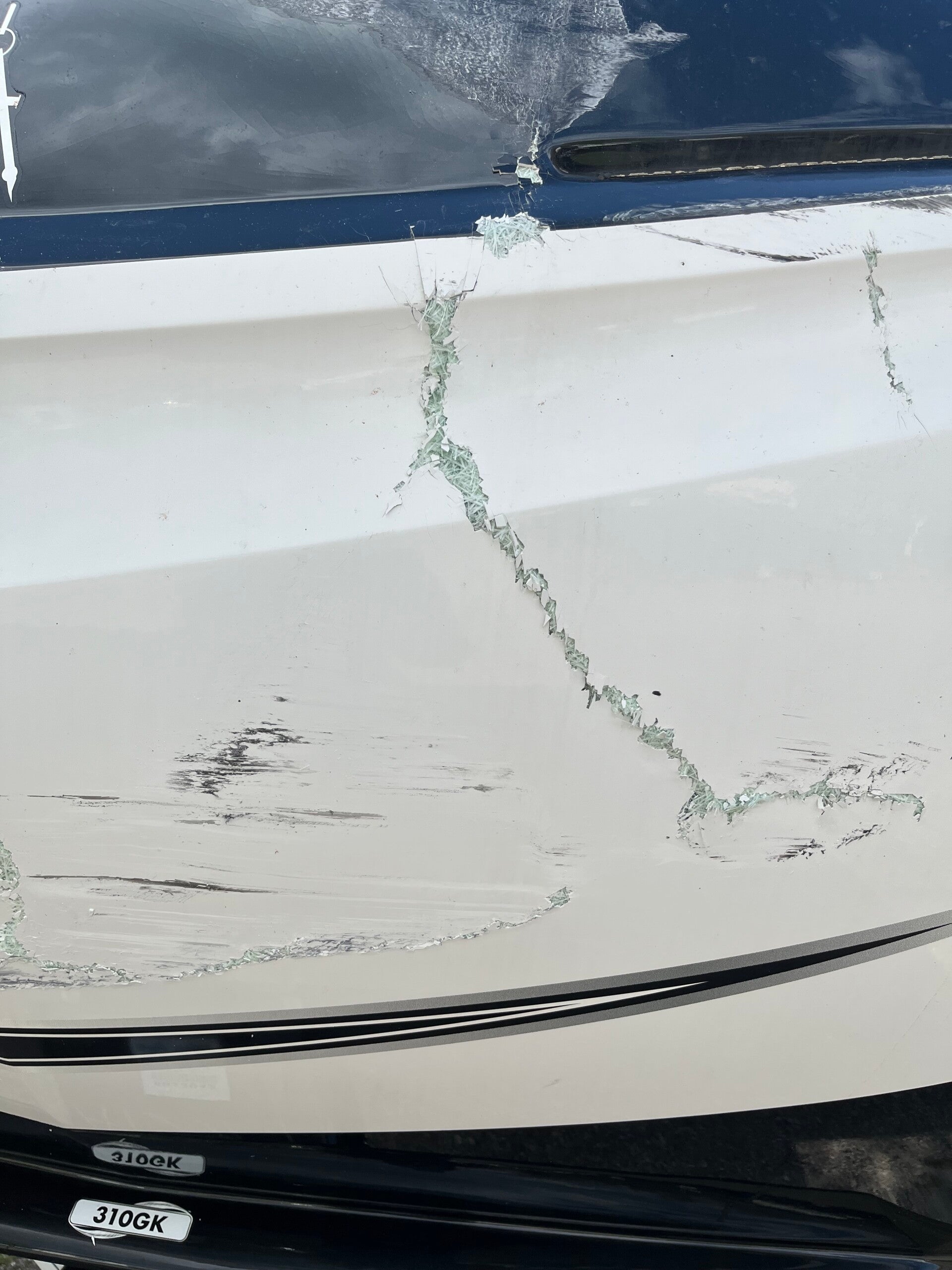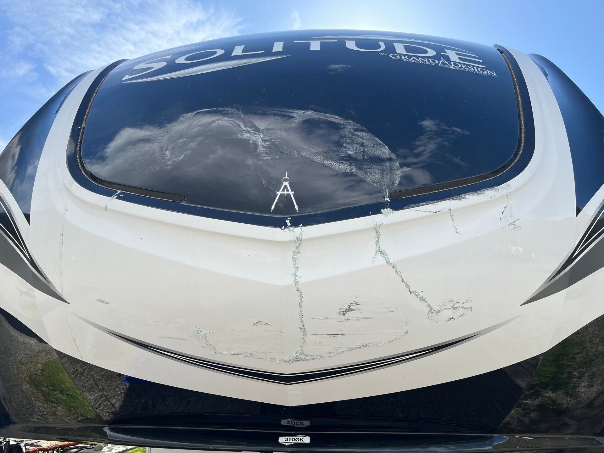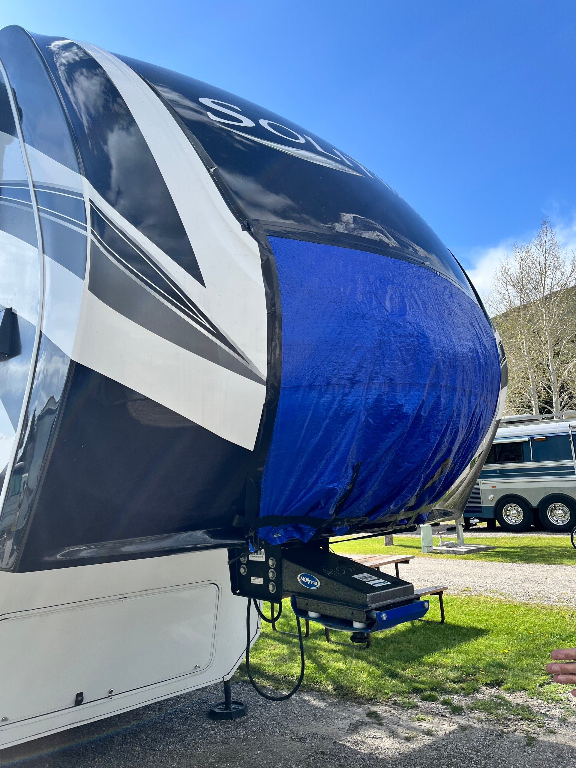 It was a great 3 days, and all was fantastic, until we were coming back to the RV park when we got a call that someone bumped into our RV while they were trying to park there rig. Uggh, not the kind call you want to receive. The pictures below are what we arrived to. Now we have to deal with insurance claims and trying to get the front cap of the 5th wheel replaced. Scheduling and living while under repair will not be fun. We'll have to find a hotel that takes dog's somewhere along our travels. Oh well, just need to roll with it.