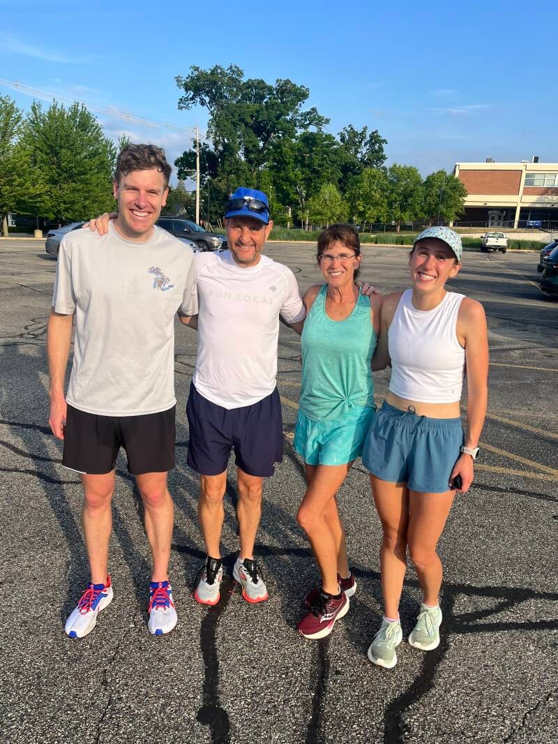 A beautiful spot along the Grand River just outside the city of Grand Rapids. As that name indicates, there is a steamboat here that runs up and down the river playing music and providing dinner. We were in town for the the wedding of Jim's nephew Brendan and his amazing new bride Charlotte. Since they are both big runners and met through running, it was fitting that the morning of the wedding started with a 6 mile run with friends and family. There were somewhere around 25 runners for this fun event and we were met at the finish line with Jim's brother Brian and his wife Amy who put together a great breakfast spread for everyone.