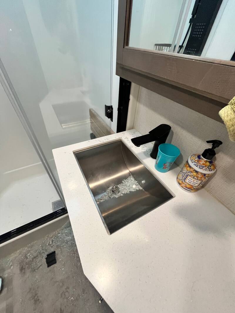 We arrived to a broken sliding glass door in our shower (bummer). All the rough roads caused the tempered glass to shatter. Clean up was not as fun as it sounds (glass everywhere, even in sink). Off to the hardware store we went. To solve for the short-term we installed a simple tension rod and shower curtain. Now that we've gotten used to it, we prefer the shower curtain to the glass doors which were difficult to clean.